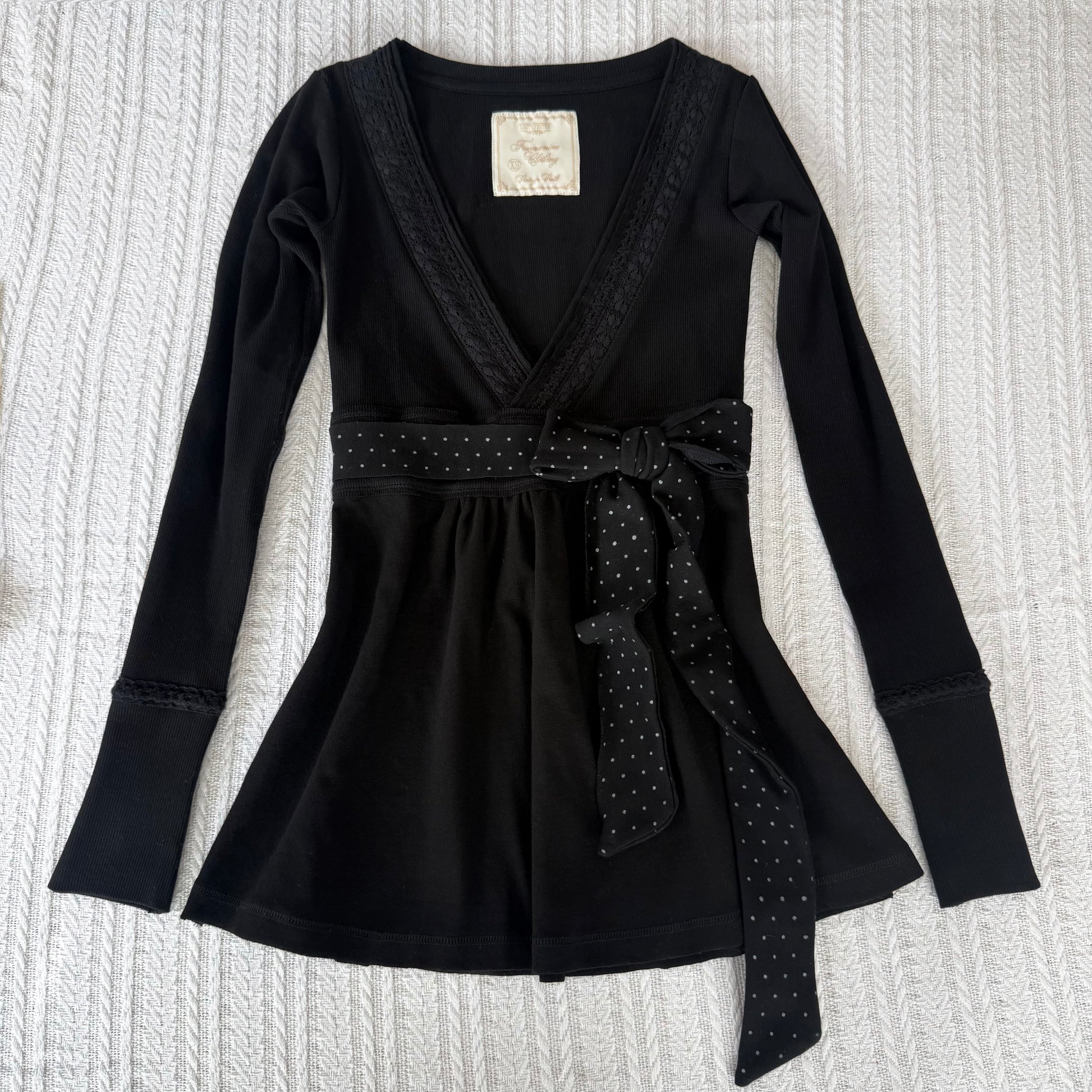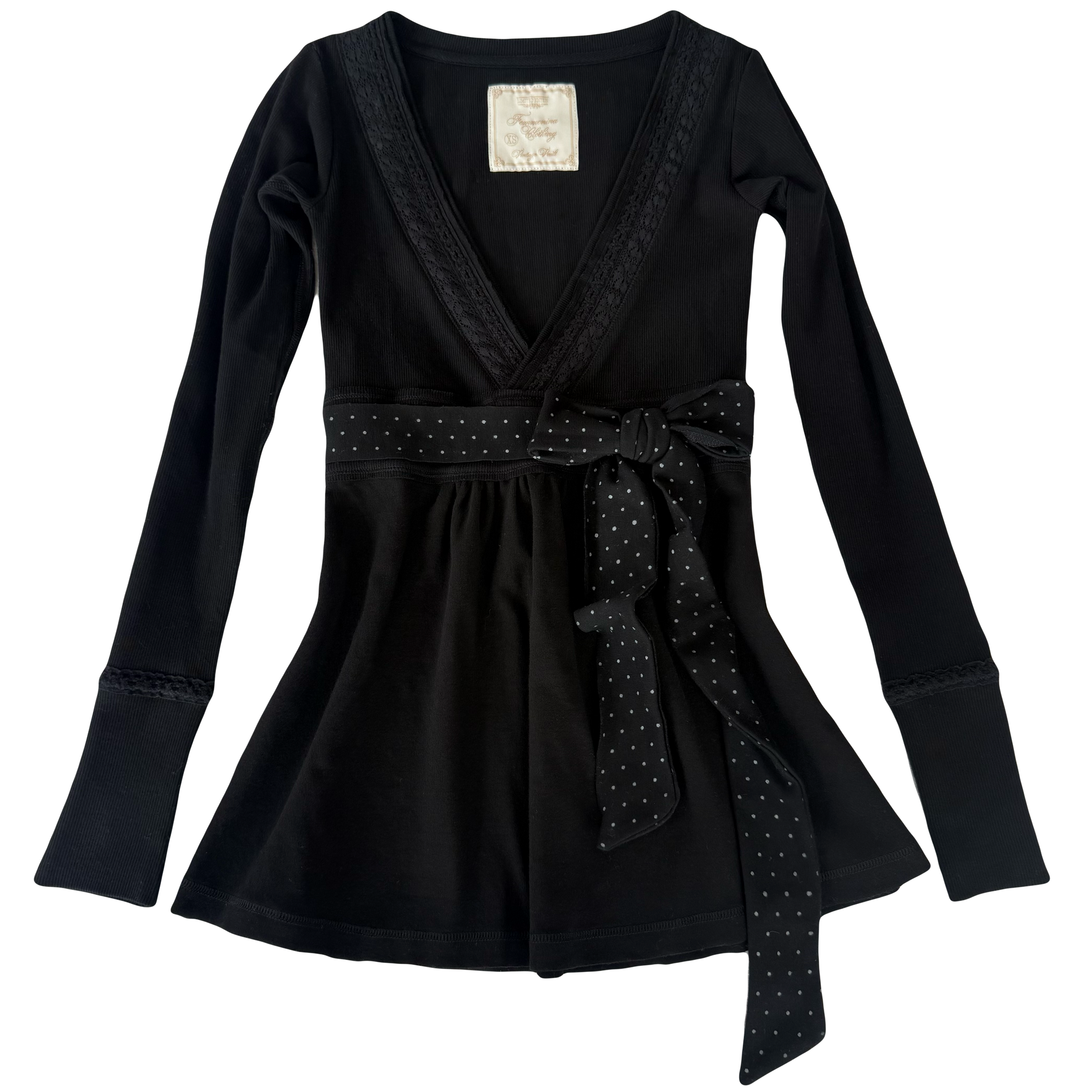 This babydoll is incredibly flattering, not boxy at all and highly details because who wants those fast fashion vibes. Its full-length cut and authentic 2000s proportions naturally highlight the waist and pair perfectly with low-rise bottoms. Complete the look with the matching polka-dot lacey cami for an effortlessly coordinated set.