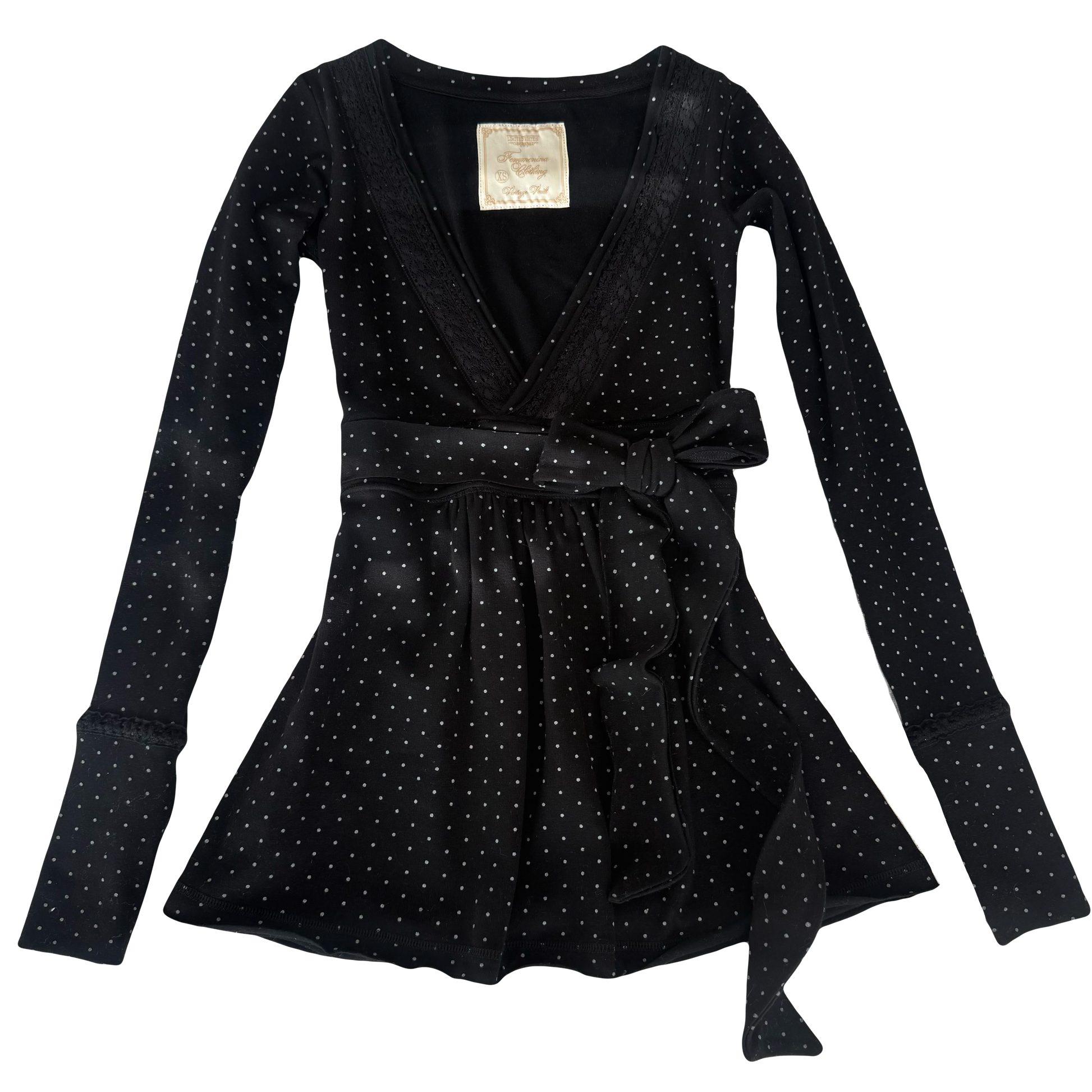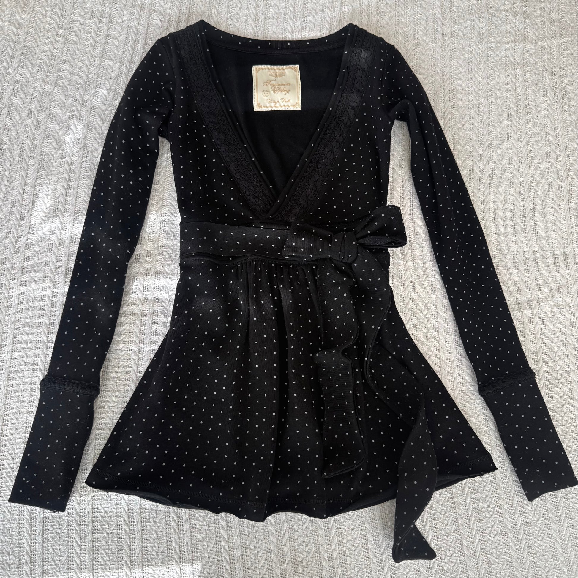 This babydoll is incredibly flattering, not boxy at all and highly details because who wants those fast fashion vibes. Its full-length cut and authentic 2000s proportions naturally highlight the waist and pair perfectly with low-rise bottoms. Complete the look with the matching polka-dot lacey cami for an effortlessly coordinated set.
