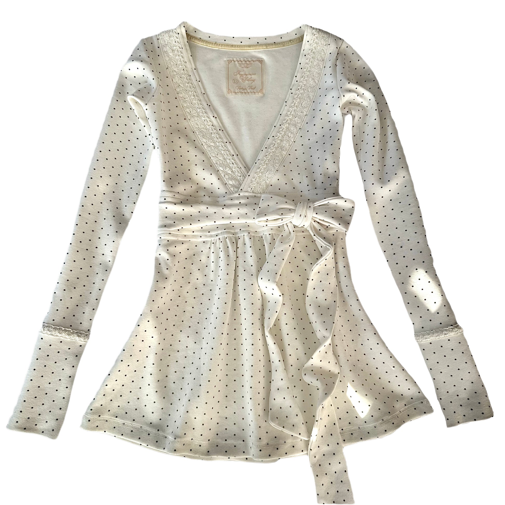 This babydoll is incredibly flattering, not boxy at all and highly details because who wants those fast fashion vibes. Its full-length cut and authentic 2000s proportions naturally highlight the waist and pair perfectly with low-rise bottoms. Complete the look with the matching polka-dot lacey cami for an effortlessly coordinated set.